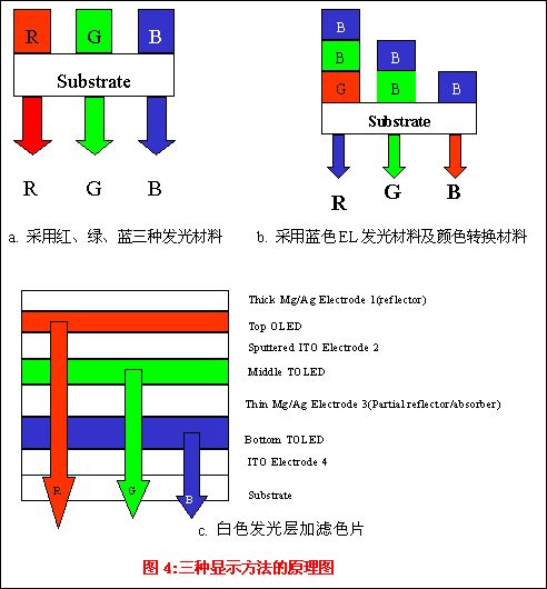 (3)采用蓝色EL发光材料,及光致发光的颜色转换材料获得全色显示。除蓝色外,再由蓝色光通过激发光致发光材料分别获得绿色和红色光。这种方法的优点是效率高,可不再使用滤色片。滤色片效率低,大致要浪费三分之二的发射光。